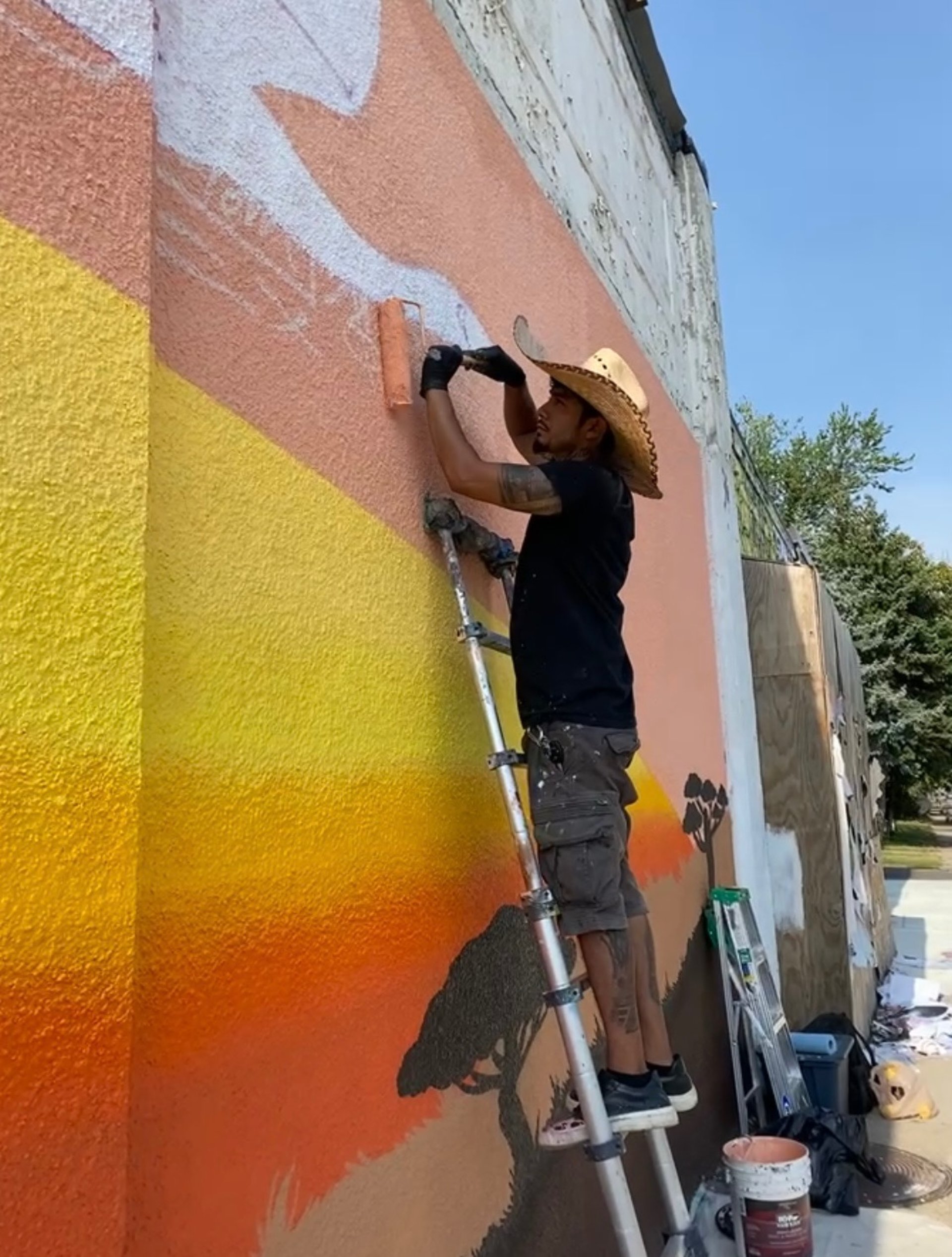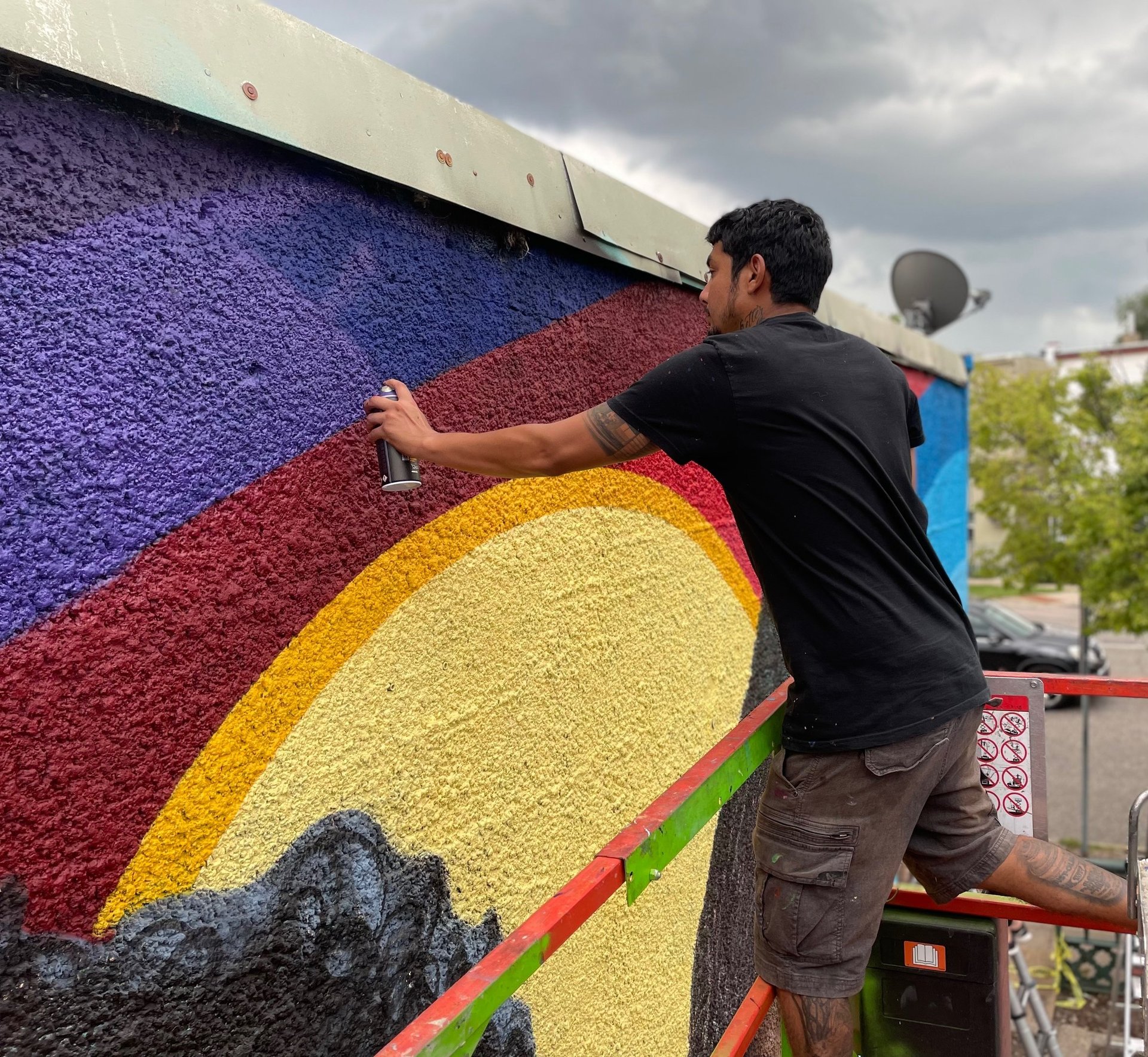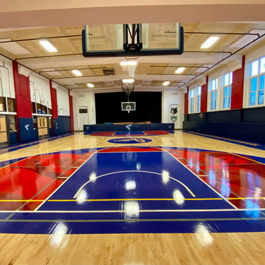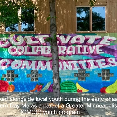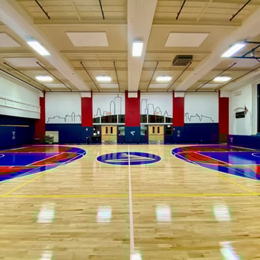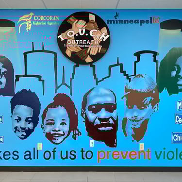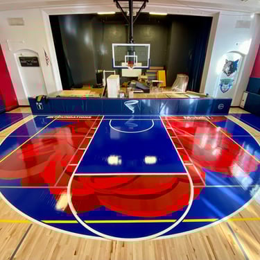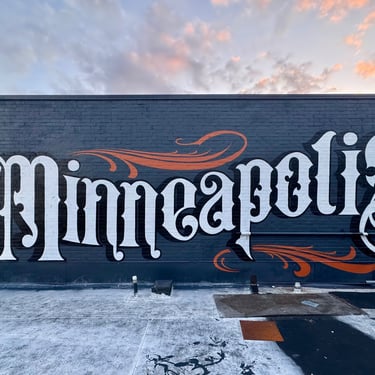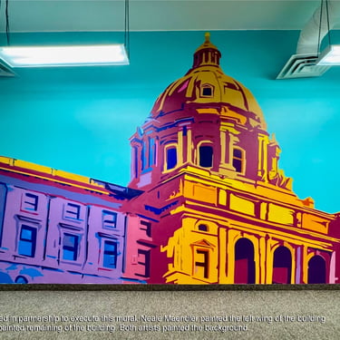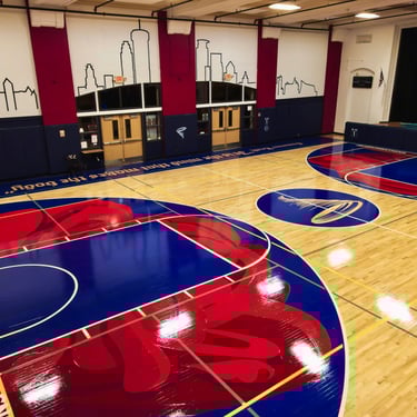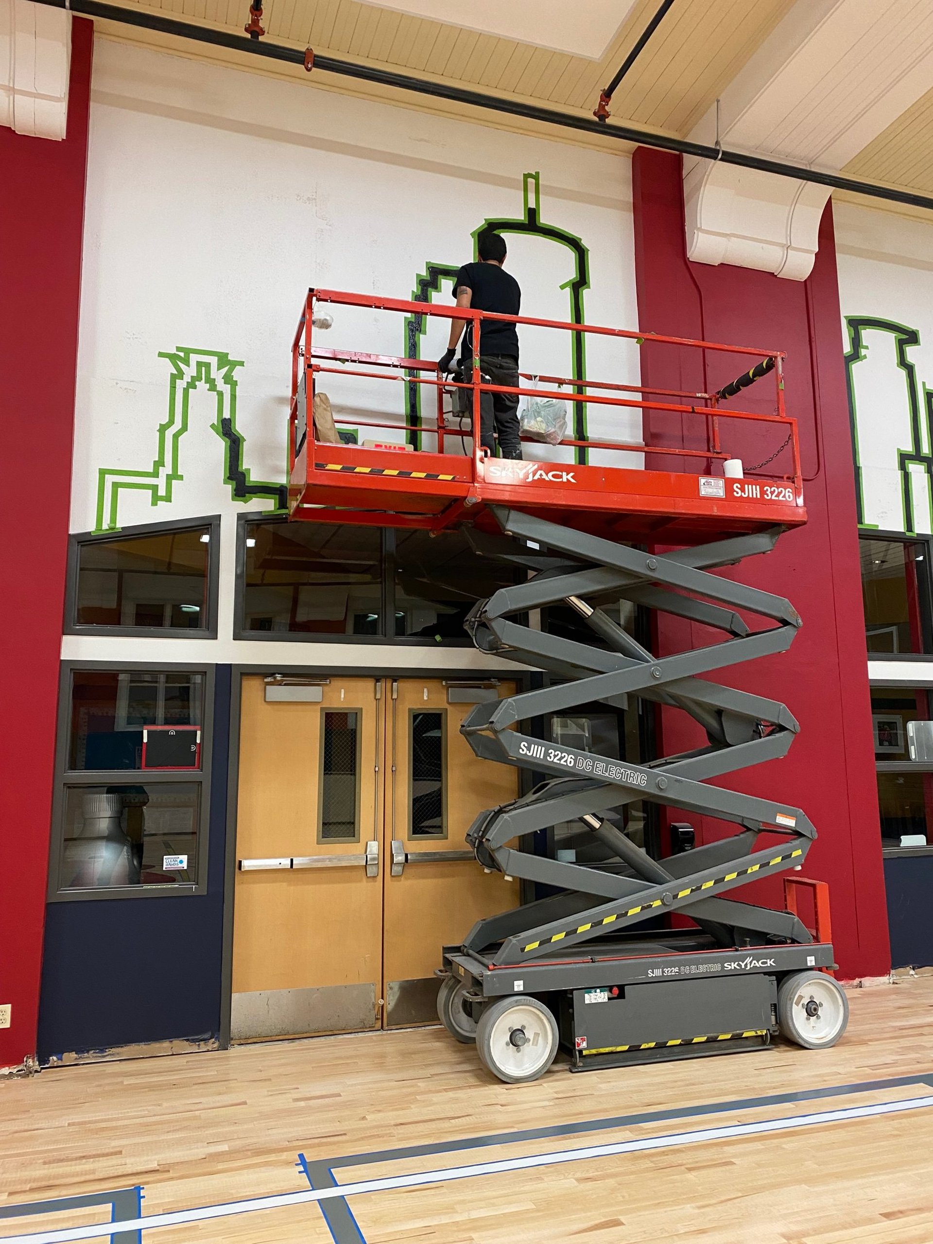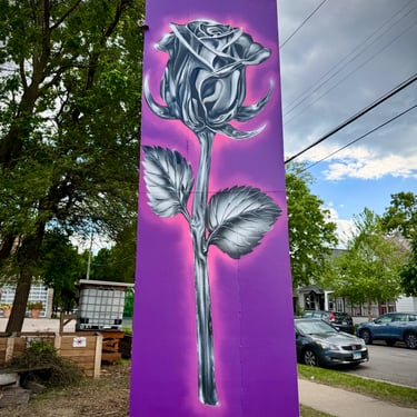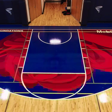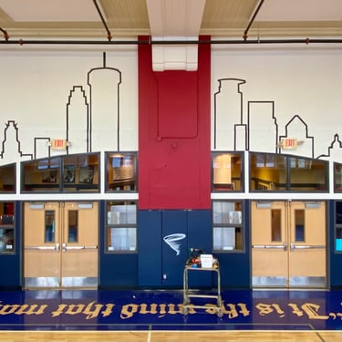 I painted two roses on the gym floor at Sojourner Truth Academy, with the Minneapolis skyline featured on a gymnasium wall. Guest artist Daren Hill assisted on the first rose. Curated by Modern Day Me.